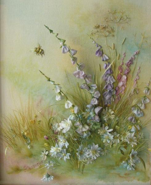 Работа выполнена в смешанной авторской технике. Свободная роспись, элементы объемной вышивки, вышивка шелковыми лентами, х/б и вискозными нитями. Травы изготовлены по авторской технологии, из натурального материала вручную каждая. Ленты изначально белые, окрашены краской для шелка.