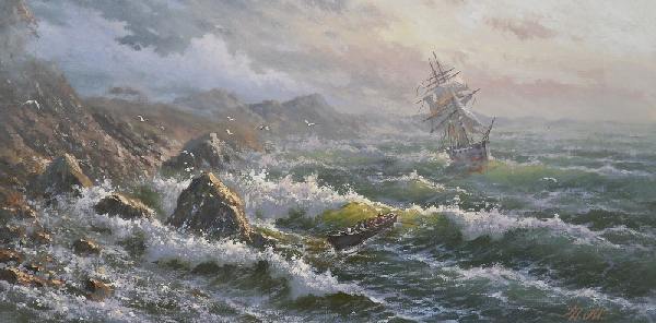 пейзаж, морской пейзаж, море, реализм, живопись, волны, горы, шторм, буря, корабль, лодка, чайки, камни